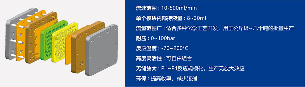 微通道反应器是采用精密加工技术制造的特征尺寸在10 ~ 300微米之间的微反应器。微反应器的“微”并不意味着微反应设备的外部尺寸小或产品产量小,是指工艺流体的通道处于微米级。连续流反应器可以包含数千万个微通道,因此也可以实现高产量。