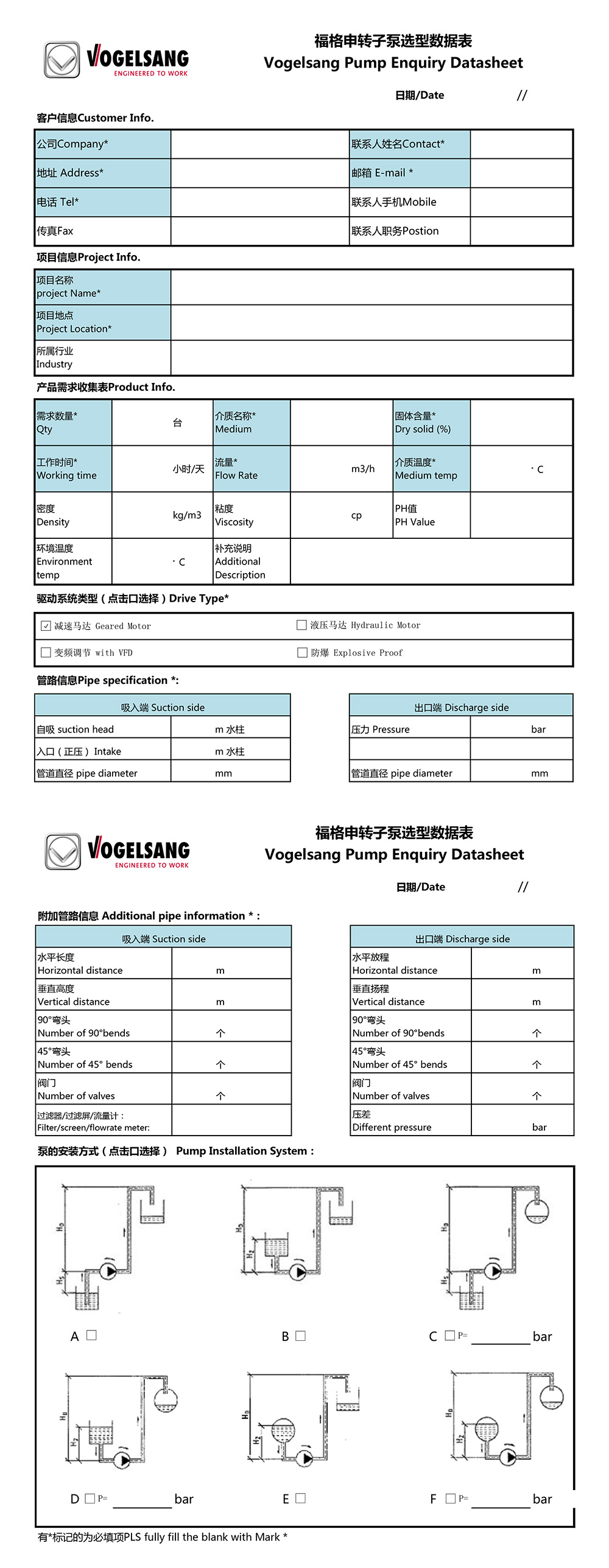 转子泵是指通过转子与泵体间的相对运动来改变工作容积,进而使液体的能量增加的泵。转子泵是一种旋转的容积式泵,具有正排量性质,其流量不随背压变化而变化。为了做出正确的选择,需要认真填写如下选型表